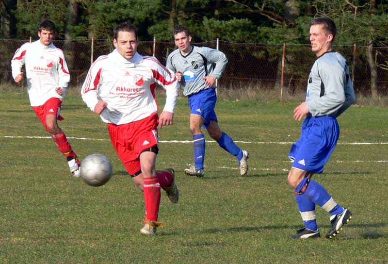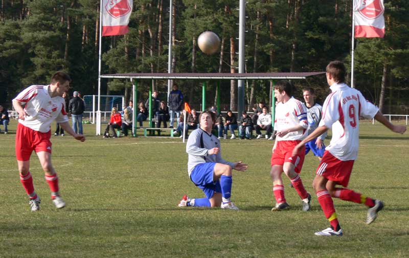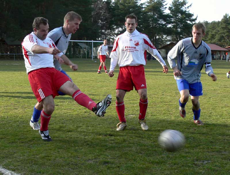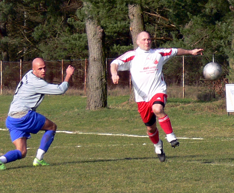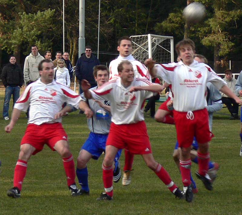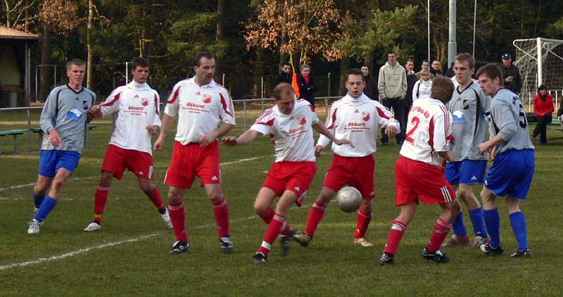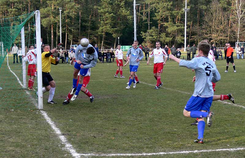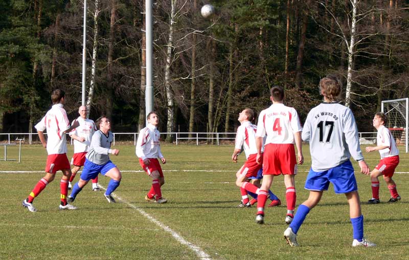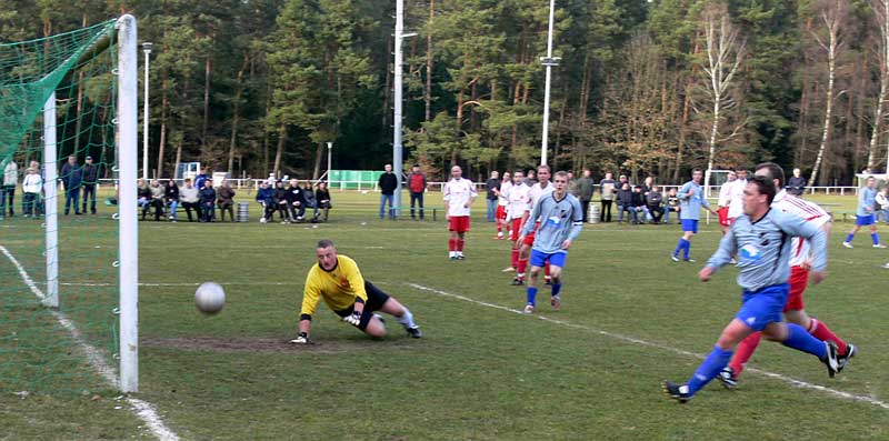 Auch im zweiten Spiel nach der Winterpause hatte sich der SFV wiederum mit einem Aufstiegskontrahenten auseinander zu setzen. Zu Gast auf der Waldsportanlage war der Tabellenzweite SV Waren 09 II. Die 1:6 Klatsche aus der Hinrunde war natürlich noch nicht vergessen. Und so hatte sich die Kaiser Elf doch einiges vorgenommen. Der SFV hatte bis auf Richter und Schnitzer zu dieser Partie alle Spieler an Bord. In der Anfangsphase schien der Gast aus Waren noch nicht auf dem Platz zu sein. Hütte machte Druck und kam zu einigen Chancen, die aber ungenutzt blieben. Nach einer halben Stunde gelang es den 09ern die Hütter Abwehr erstmalig ernsthaft zu testen, ohne jedoch wirklich gefährlich zu werden. In der zweiten Halbzeit ging es erst so weiter wie Ende der Ersten. Nach einem gefährlichen Angriff in der 58. Minute versenkte Christian Möller von halblinks das Leder zum 1:0. Ein langer Ball war von Waren etwa 25m vor dem eigenen Tor quer ins Spielfeld geköpft, genau zu C.Möller, der dann letztendlich zum 1:0 einschießen konnte. Nun drückten die Warener auf den Ausgleich. In der Folgezeit stand die Hütter Abwehr um Braun und Bielefeldt unter Dauerdruck. Die sich daraus ergebenden Konter konnten mehrfach durch Leusch und Möller jedoch nicht genutzt werden. Die Warener kamen zu vielen Chancen, vermochten aber keine zu nutzen. Mehrere Fernschüsse verfehlten nur um Zentimeter das Ziel. Eine abgerutschte Flanke und ein Kopfball konnte SFV Torwart Pinszak mit Glanzparaden über die Latte lenken. Auf beiden Seiten wurden zwei Elfmeter durch Schiri Erdmann, der nicht immer einen sicheren Eindruck machte, nicht gegeben. Dann die 92. Minute. Über die linke Seite wurde ein letzter Konter des SFV eingeleitet und der Ball hoch diagonal in den Strafraum gebracht. Der gerade eingewechselte Maik Frehse fackelte nicht lange, nahm den Ball nach dem Aufprall volley und tunnelte den 09-Torhüter zum 2:0 Endstand. Die Hütter Elf demonstrierte an diesem Tag klar und deutlich in welcher Liga sie im nächsten Jahr spielen will.